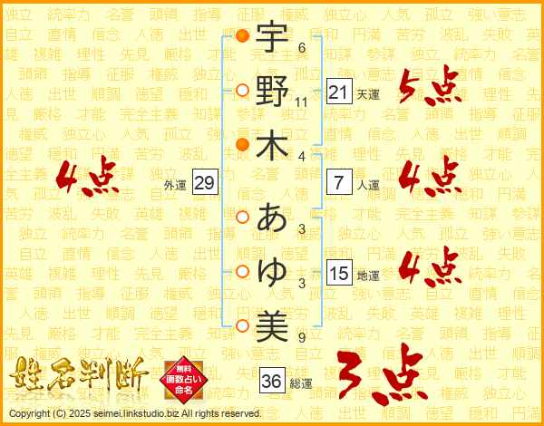 宇(6画)野(11画)木(4画) あ(3画)ゆ(3画)美(9画)