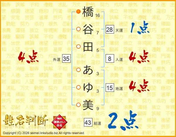 橋谷田あゆ美さんの総運は43画の2点!