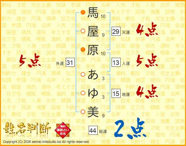 馬(10画)屋(9画)原(10画) あ(3画)ゆ(3画)美(9画)