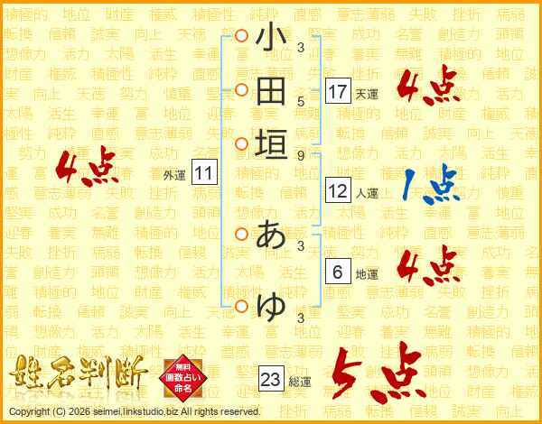 小(3画)田(5画)垣(9画) あ(3画)ゆ(3画)