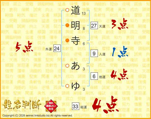 道(13画)明(8画)寺(6画) あ(3画)ゆ(3画)