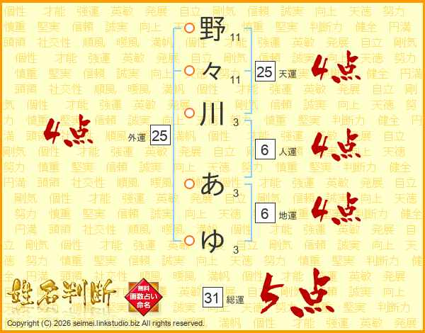 野々川あゆさんの総運は31画の5点!