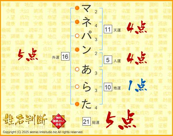 生活面を象徴する運勢です。外部から受ける影響力を表し、結婚運、家庭運や職場、環境への順応性を表します。総運から人運を引いた画数。姓や名が1文字の場合を除く。