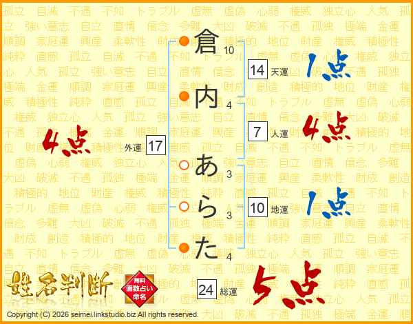 倉内あらたさんの総運は24画の5点!