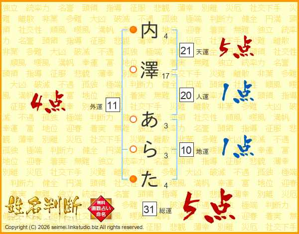 内澤あらたさんの総運は31画の5点!