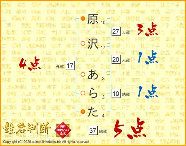 原(10画)沢(17画) あ(3画)ら(3画)た(4画)