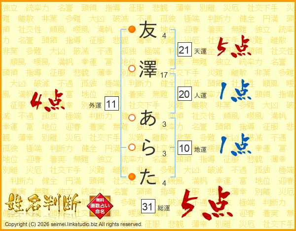 友澤あらたさんの総運は31画の5点!
