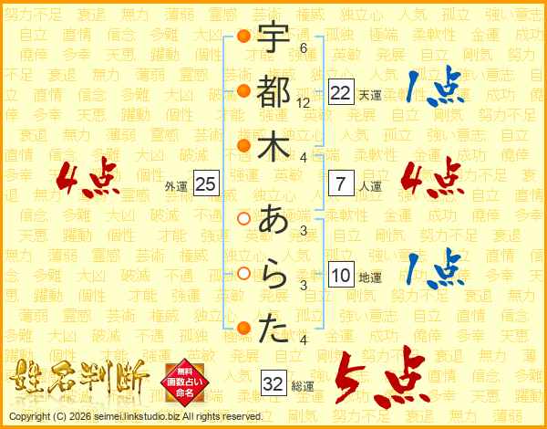 宇(6画)都(12画)木(4画) あ(3画)ら(3画)た(4画)