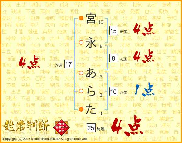 宮永あらたさんの総運は25画の4点!