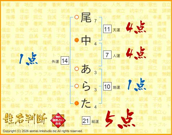 生活面を象徴する運勢です。外部から受ける影響力を表し、結婚運、家庭運や職場、環境への順応性を表します。総運から人運を引いた画数。姓や名が1文字の場合を除く。
