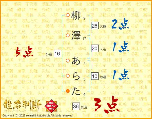 柳(9画)澤(17画) あ(3画)ら(3画)た(4画)
