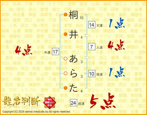 桐(10画)井(4画) あ(3画)ら(3画)た(4画)