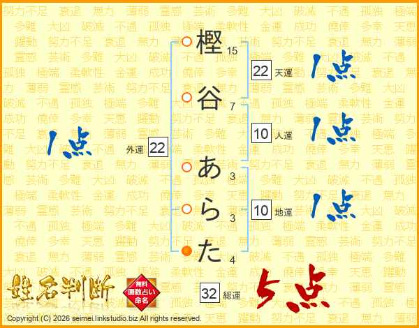 樫谷あらたさんの天運は22画の1点!