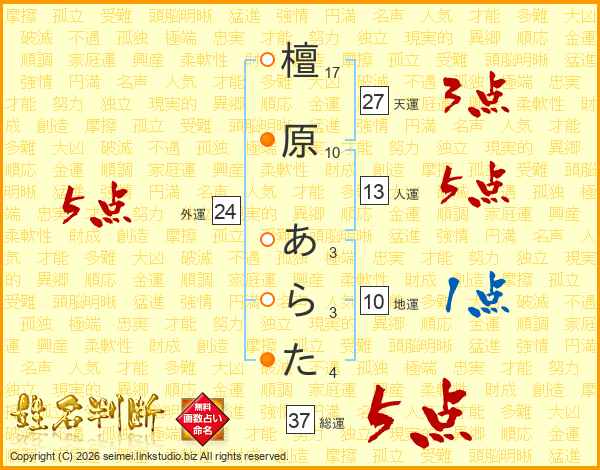 檀原あらたさんの総運は37画の5点!