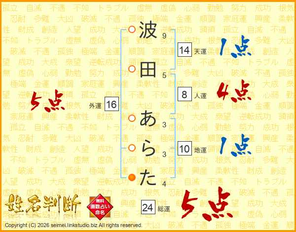 波(9画)田(5画) あ(3画)ら(3画)た(4画)