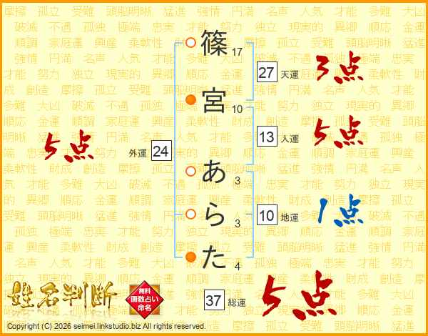 篠宮あらたさんの総運は37画の5点!
