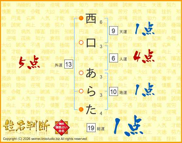 西口あらたさんの総運は19画の1点!