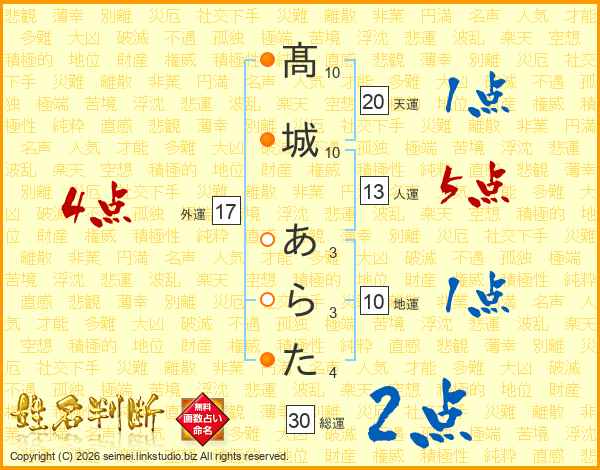 髙(10画)城(10画) あ(3画)ら(3画)た(4画)