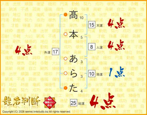 髙本あらたさんの総運は25画の4点!
