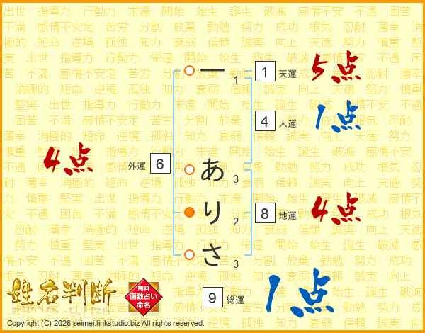生活面を象徴する運勢です。外部から受ける影響力を表し、結婚運、家庭運や職場、環境への順応性を表します。総運から人運を引いた画数。姓や名が1文字の場合を除く。