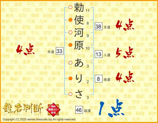 生活面を象徴する運勢です。外部から受ける影響力を表し、結婚運、家庭運や職場、環境への順応性を表します。総運から人運を引いた画数。姓や名が1文字の場合を除く。
