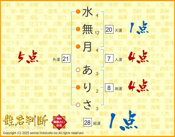 水(4画)無(12画)月(4画) あ(3画)り(2画)さ(3画)