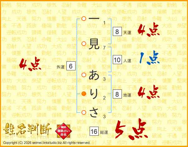 生活面を象徴する運勢です。外部から受ける影響力を表し、結婚運、家庭運や職場、環境への順応性を表します。総運から人運を引いた画数。姓や名が1文字の場合を除く。