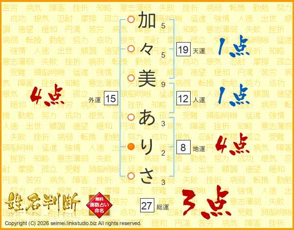 加(5画)々(5画)美(9画) あ(3画)り(2画)さ(3画)