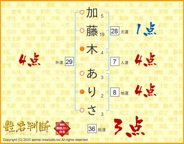 生活面を象徴する運勢です。外部から受ける影響力を表し、結婚運、家庭運や職場、環境への順応性を表します。総運から人運を引いた画数。姓や名が1文字の場合を除く。