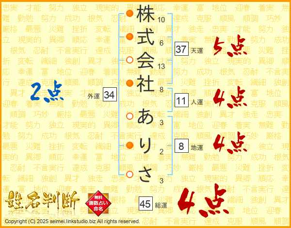株(10画)式(6画)会(13画)社(8画) あ(3画)り(2画)さ(3画)
