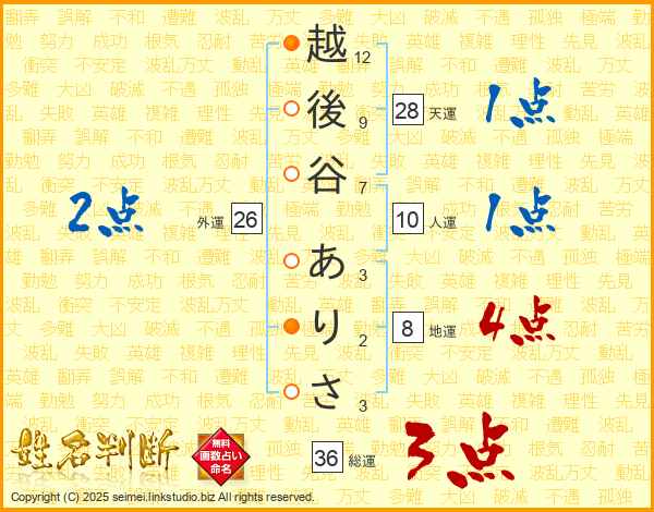 生活面を象徴する運勢です。外部から受ける影響力を表し、結婚運、家庭運や職場、環境への順応性を表します。総運から人運を引いた画数。姓や名が1文字の場合を除く。