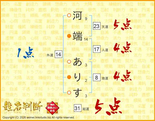 生活面を象徴する運勢です。外部から受ける影響力を表し、結婚運、家庭運や職場、環境への順応性を表します。総運から人運を引いた画数。姓や名が1文字の場合を除く。