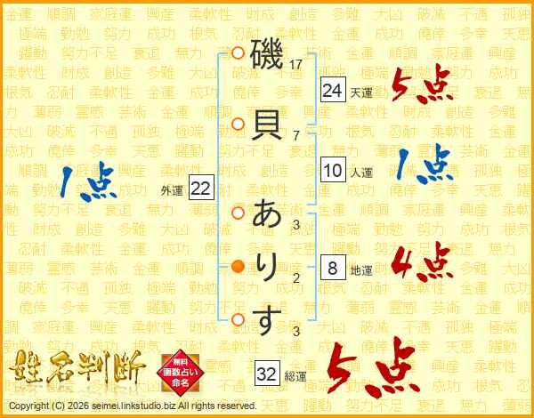 磯(17画)貝(7画) あ(3画)り(2画)す(3画)