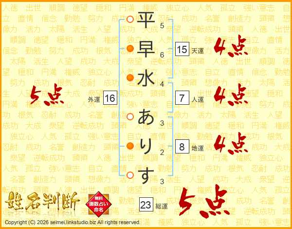平早水ありすさんの総運は23画の5点!