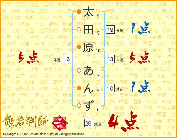 太(4画)田(5画)原(10画) あ(3画)ん(2画)ず(5画)