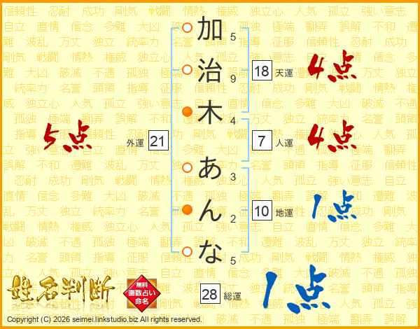 加(5画)治(9画)木(4画) あ(3画)ん(2画)な(5画)
