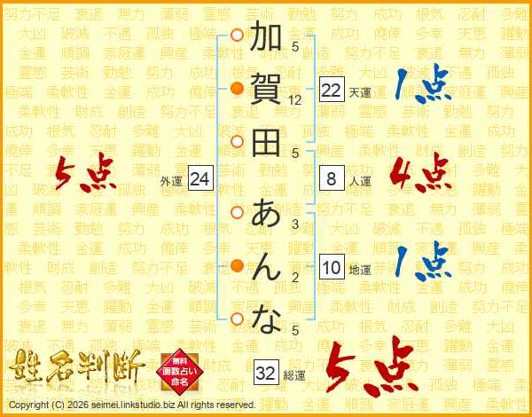 加(5画)賀(12画)田(5画) あ(3画)ん(2画)な(5画)