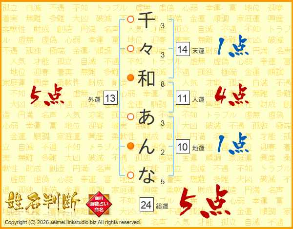 千(3画)々(3画)和(8画) あ(3画)ん(2画)な(5画)