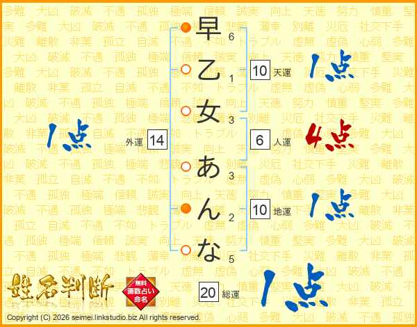 生活面を象徴する運勢です。外部から受ける影響力を表し、結婚運、家庭運や職場、環境への順応性を表します。総運から人運を引いた画数。姓や名が1文字の場合を除く。