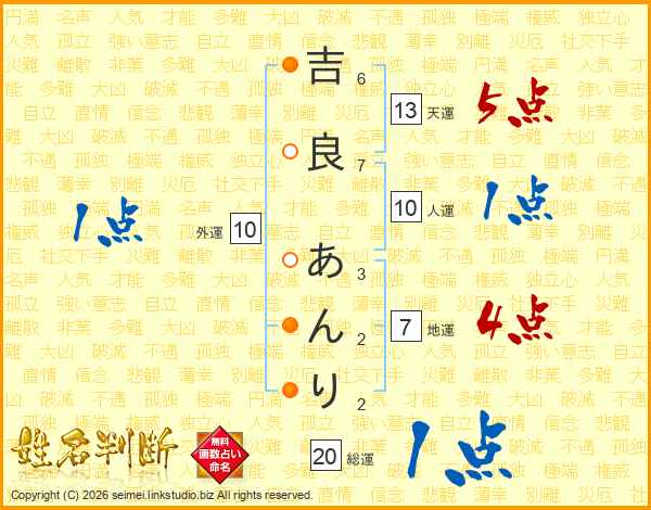 吉良あんりさんの総運は20画の1点!