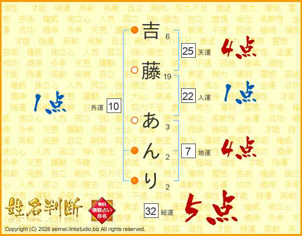 吉(6画)藤(19画) あ(3画)ん(2画)り(2画)