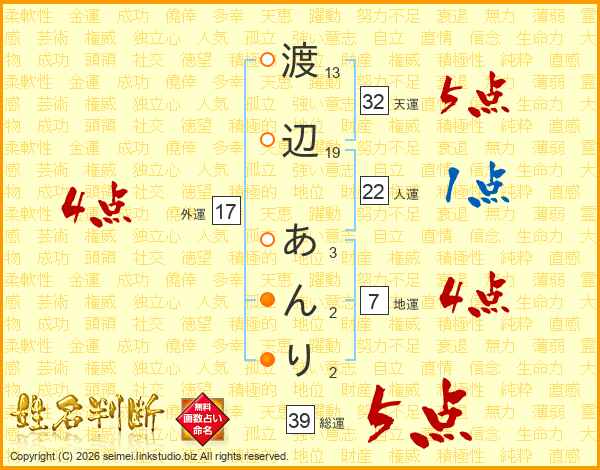 渡辺あんりさんの総運は39画の5点!