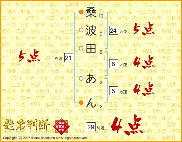 桑(10画)波(9画)田(5画) あ(3画)ん(2画)