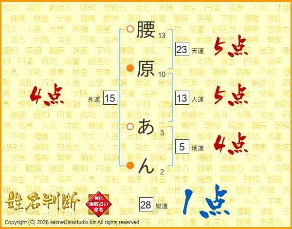 腰原あんさんの天運は23画の5点!