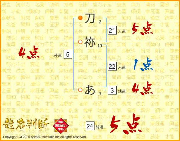 生活面を象徴する運勢です。外部から受ける影響力を表し、結婚運、家庭運や職場、環境への順応性を表します。総運から人運を引いた画数。姓や名が1文字の場合を除く。