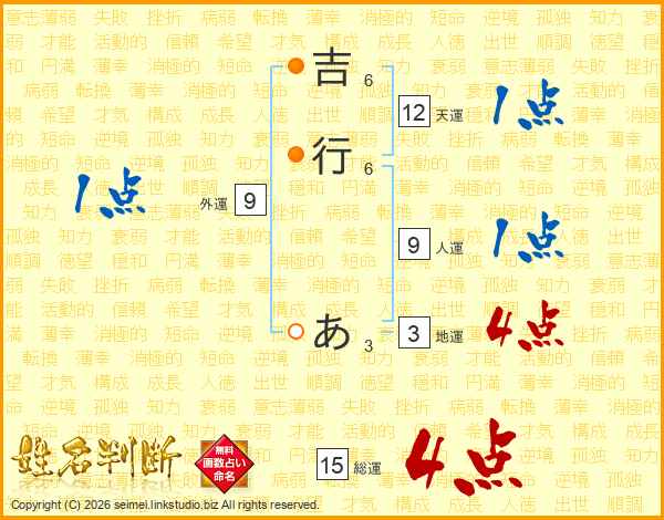 あなたの人生を表す1番重要な運勢です。生涯を通じて影響する総合運となり、主に50歳以降の晩年期に影響を及ぼします。苗字と名前の合計画数。