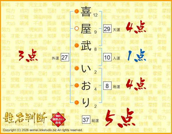 喜屋武いおりさんの総運は37画の5点!