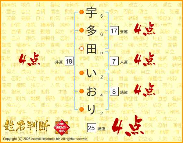 宇(6画)多(6画)田(5画) い(2画)お(4画)り(2画)