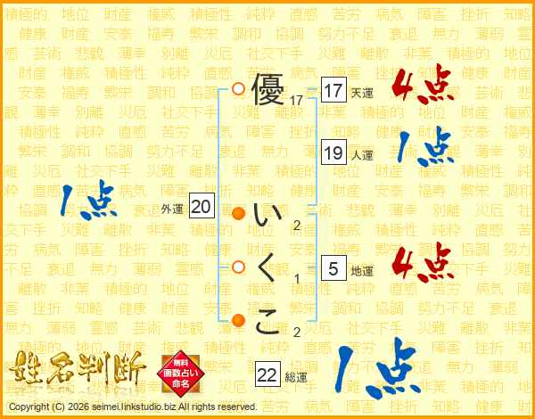 生活面を象徴する運勢です。外部から受ける影響力を表し、結婚運、家庭運や職場、環境への順応性を表します。総運から人運を引いた画数。姓や名が1文字の場合を除く。