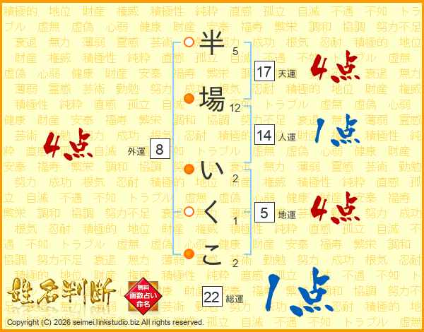 生活面を象徴する運勢です。外部から受ける影響力を表し、結婚運、家庭運や職場、環境への順応性を表します。総運から人運を引いた画数。姓や名が1文字の場合を除く。